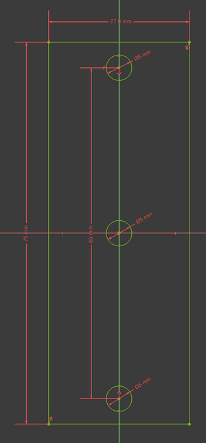The mounting bar, which is relatively thin and directly contacts the CPU cooler, cannot be 3D-printed in plastic. Aluminum works, and is easy to work with. A simple mounting bar can be cut from 2.0 mm thick bar stock, machined to 27.6mm in width, and drilled according to the drawing in this section. Alternatively, a completed mounting bar could be ordered from a service such as SendCutSend using the attached STEP file.