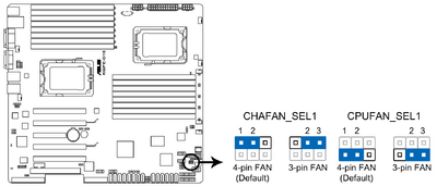 The coreboot-15h release ROMs for KGPE-D16 are configured to adjust fan speeds based on temperatures measured at the CPUs and the Northbridge. The KGPE-D16 has two fan zones: one for CPU fans (CPUFAN_SEL1) and one for chassis fans (CHAFAN_SEL1). These can be assigned to either 4-pin (PWM regulated) or 3-pin (Voltage regulated) fan control outputs. The 4-pin (PWM regulation) mode offers better control over fan speeds and is the recommended setting for both fan zones. It is important to not use a 4-pin fan in a zone configured for 3-pin control; the fan will receive both voltage regulation and PWM regulation, causing irregular fan speeds. For quiet 3-pin chassis fans, it is recommended to leave the CHAFAN_SEL1 set to 4-pin (PWM regulation) mode. This will let the 3-pin chassis fans operate at 100% speed regardless of thermal readings.