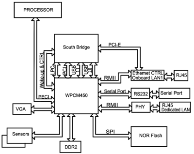 The Nuvoton WPCM450 is a combined Baseboard Management Controller and 2D/VGA-compatible Graphics Core with PCI Interface, Virtual Media, Keyboard and KVMR Module[1]. Multiple vendors shipped the WPCM450 with Linux, making it feasible to build an open source replacement for the original BMC firmware[2][3][4]. 3rd party documentation and tools have been developed by neuschaefer and are available on github. The WPCM450 appears to be related to, or based on, the Winbond W90N745.